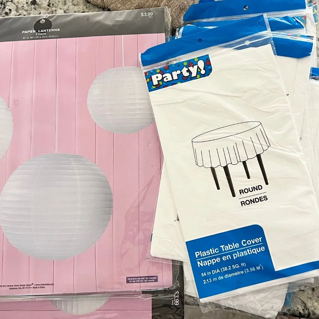 White plastic tablecloths, round are perfect! Can’t find them? Just get what the store has and you can trim the bottom once they’re hung, or not!